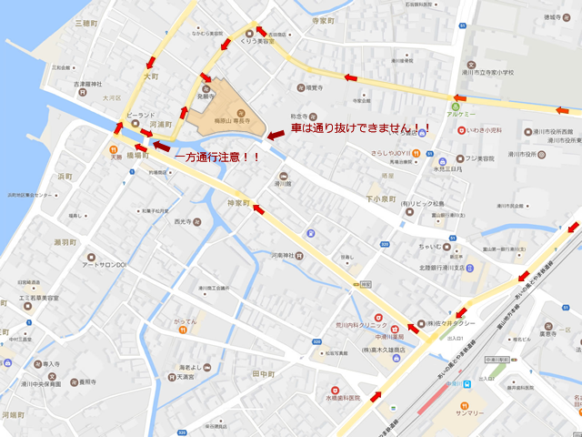 当山周辺は道路が狭いので、運転は十分注意してお越しください。また、一方通行の道路が多くありますのでご注意ください。